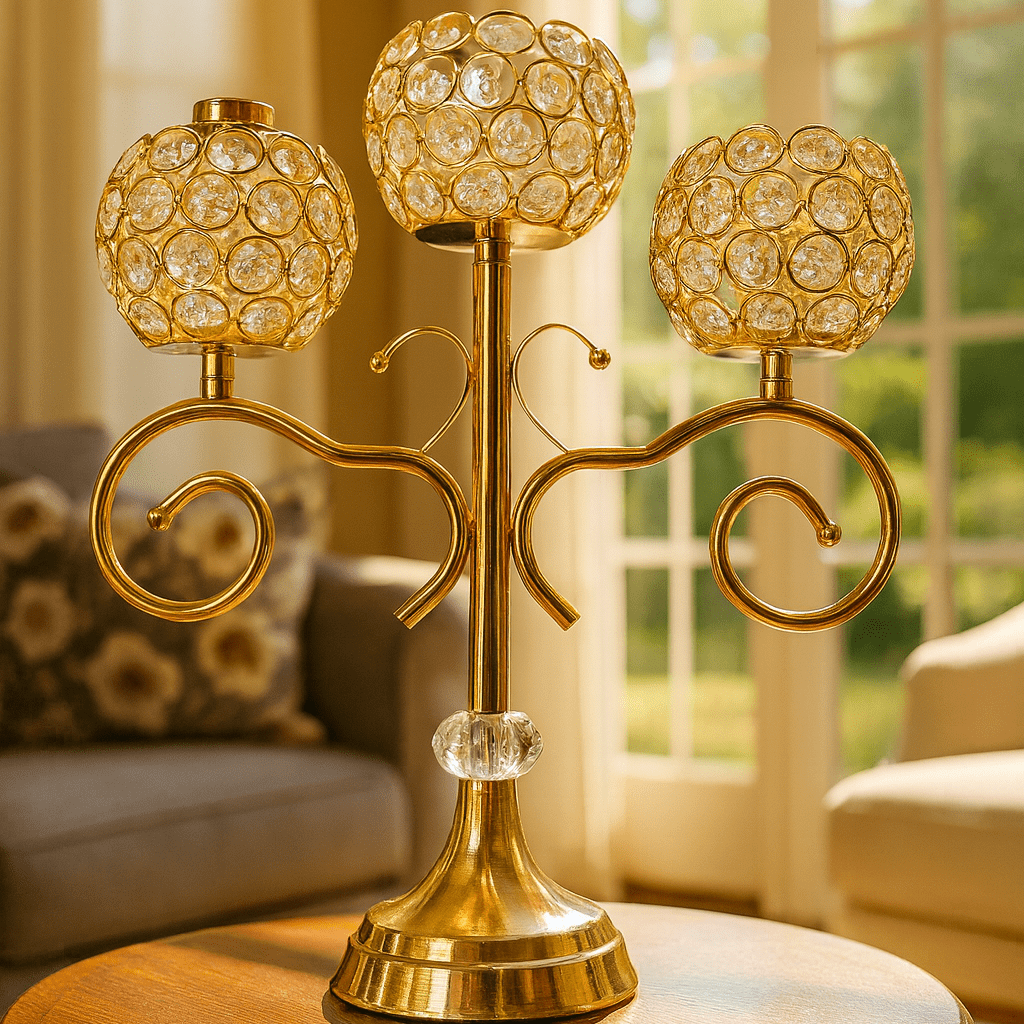 Crystal 3-Head Candle Holder – Elegant Golden Table Centerpiece with Diamond Globe Design 💎✨
